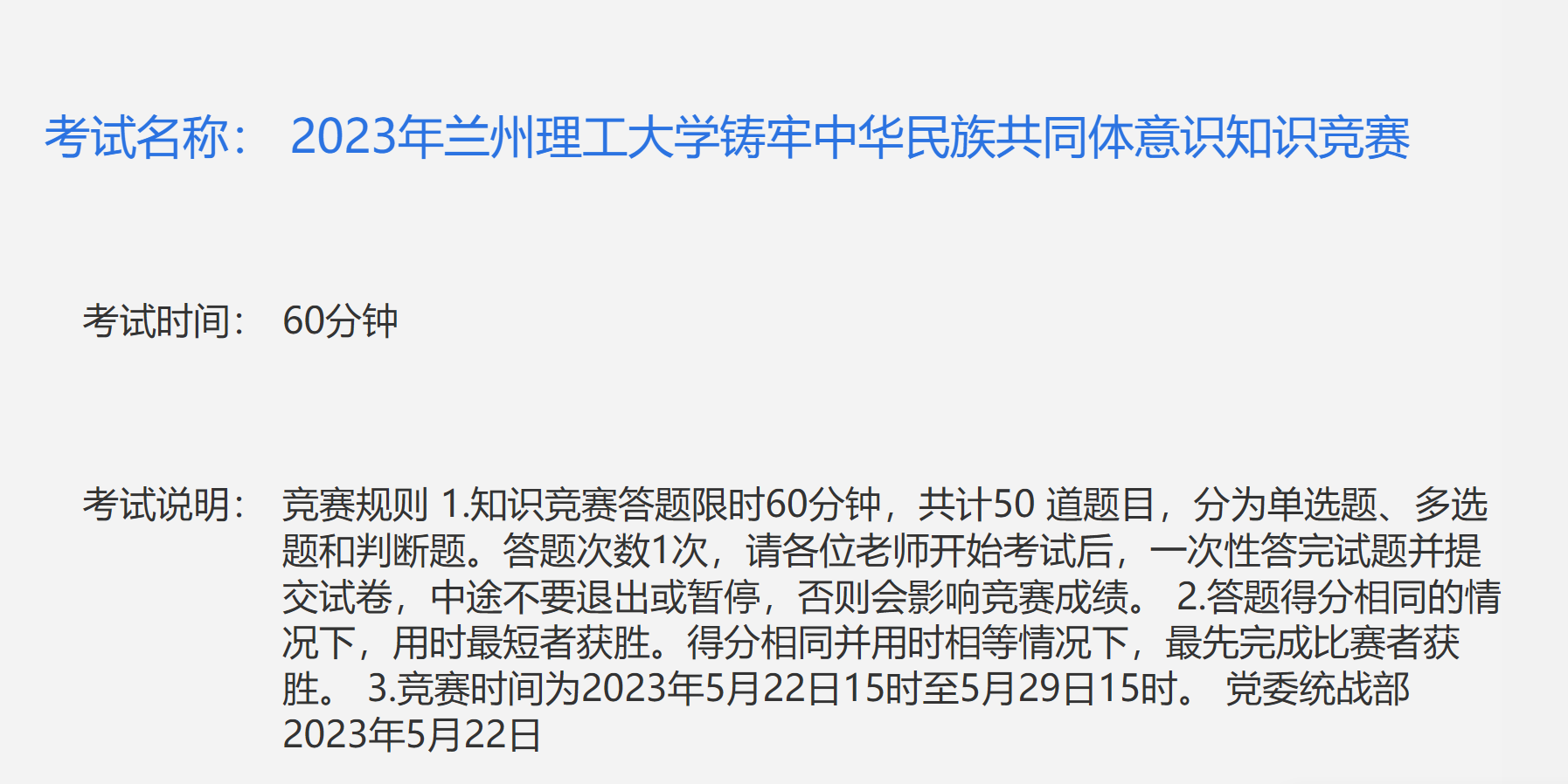 今年5月,是全省第19个民族团结进步宣传月,是中央和省委民族工作会议之后的第一个宣传月。为加强宣传,开云全站精心组织开展了专题宣传、学习研讨、理论宣讲、知识竞答、社会实践、影视展播等丰富多彩的活动。其中知识竞答部分使用专业技术人员继续教育网络平台组织全校教职工在线答题,得到大家一致好评。
