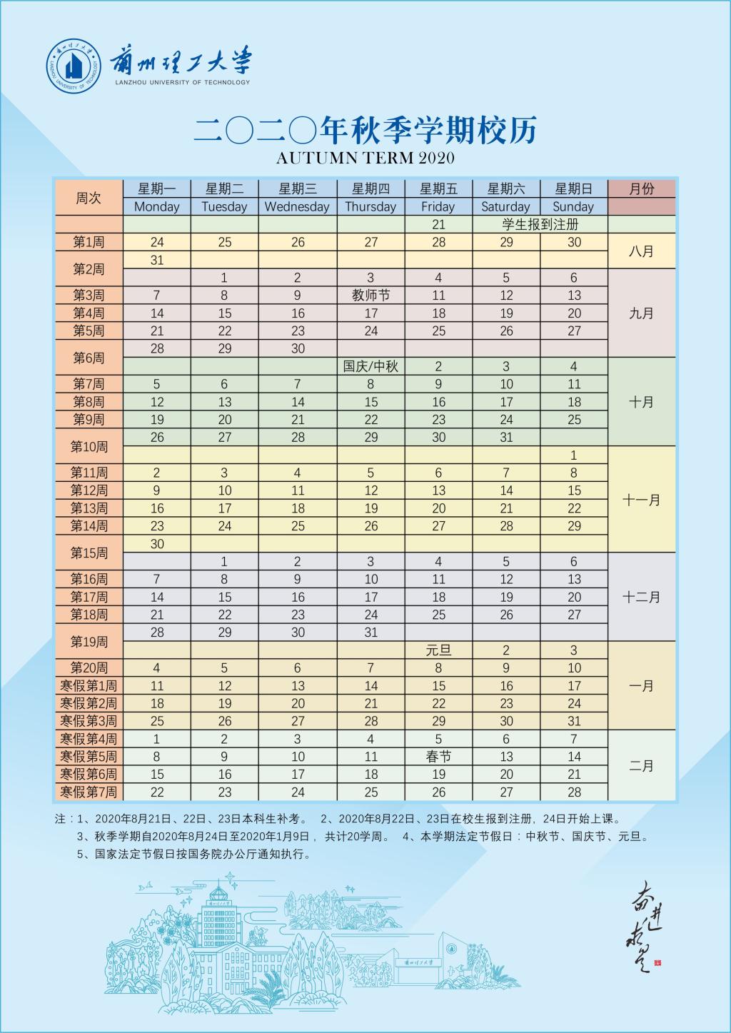 2020年秋季学期校历